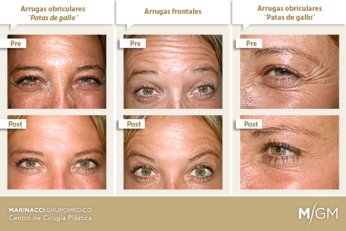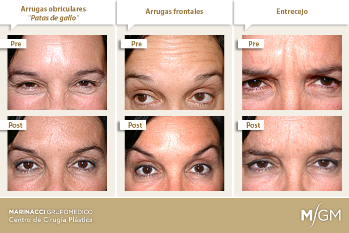 La toxina botulínica se utiliza desde hace más de 15 años ampliamente en el mejoramiento cosmético de las arrugas de expresión. Su mecanismo de acción se realiza al bloquear selectivamente la acción de ese músculo infiltrado. Es ideal para las arrugas de expresión alrededor de los ojos (“patas de gallo”), arrugas de entrecejo y de la frente. El procedimiento se realiza en el consultorio adecuado y el paciente inmediatamente se retira a su domicilio, comenzando el efecto rejuvenecedor entre el 3° y 5° día. Persiste el mismo durante 4 ó 6 meses.Botox -